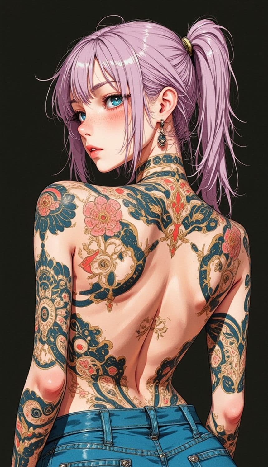 A striking illustration of a woman with lavender hair tied in a ponytail, showcasing an intricate back tattoo that features floral and symmetrical designs in shades of blue and pink. She is dressed in blue jeans and displays a confident and artistic presence.