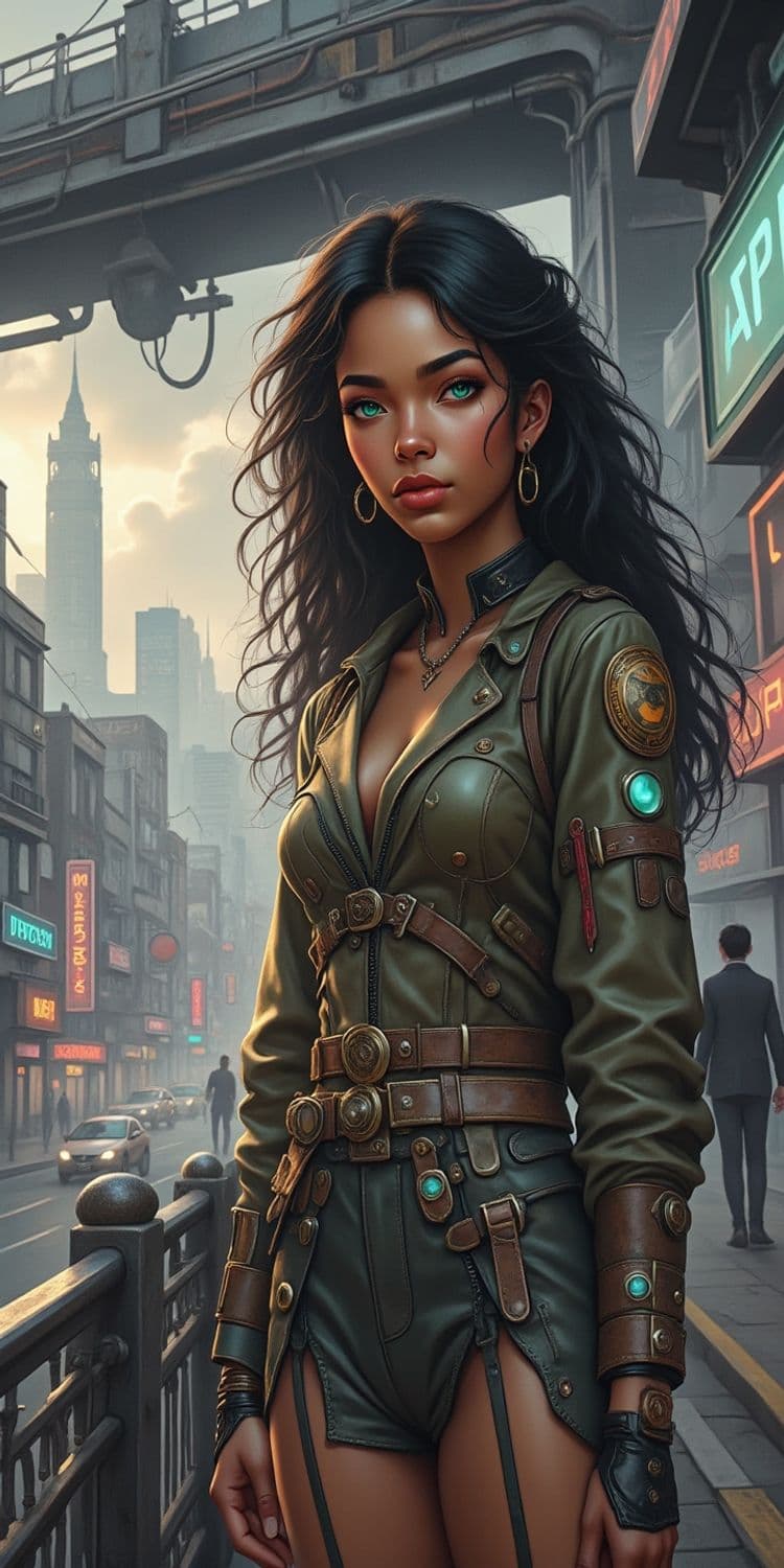 A futuristic, confident female character stands in a bustling urban setting with towering skyscrapers in the background. She wears a stylish, olive-green military-inspired outfit adorned with intricate buckles and glowing teal accents. Her wavy black hair flows down, and she is accessorized with hoop earrings and a pendant necklace. The surrounding cityscape includes neon signs, adding to the cyberpunk ambiance.