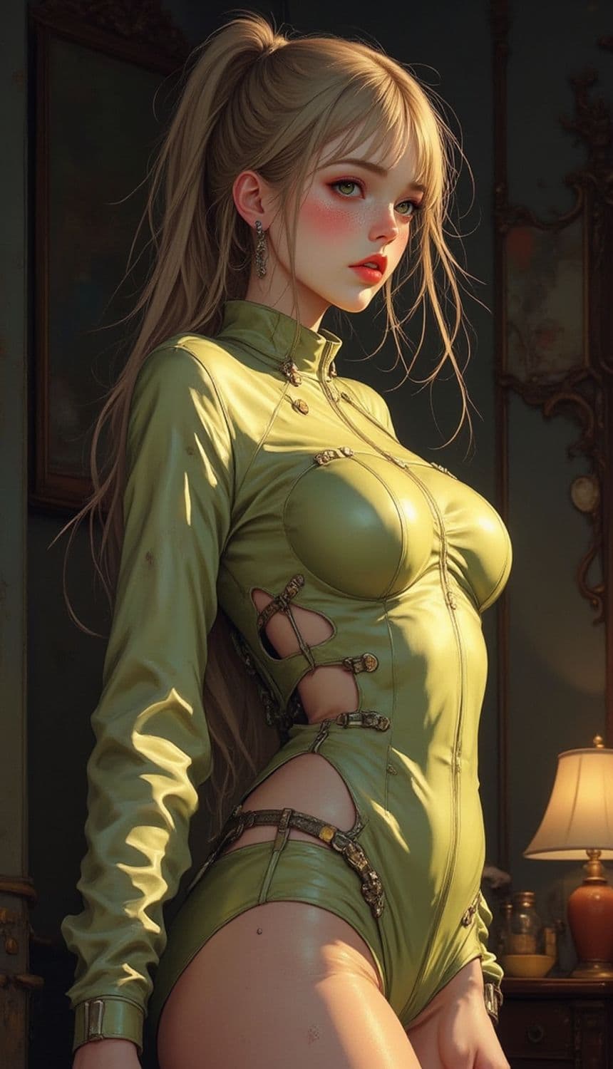 A young woman stands confidently, wearing a form-fitting, olive green outfit with intricate metallic buckles and cutouts revealing parts of her skin. Her long blonde hair is styled in a high ponytail, and she has a focused, intense expression. The setting is dimly lit, with a warm glow from a lamp in the background, giving the image a sophisticated atmosphere.