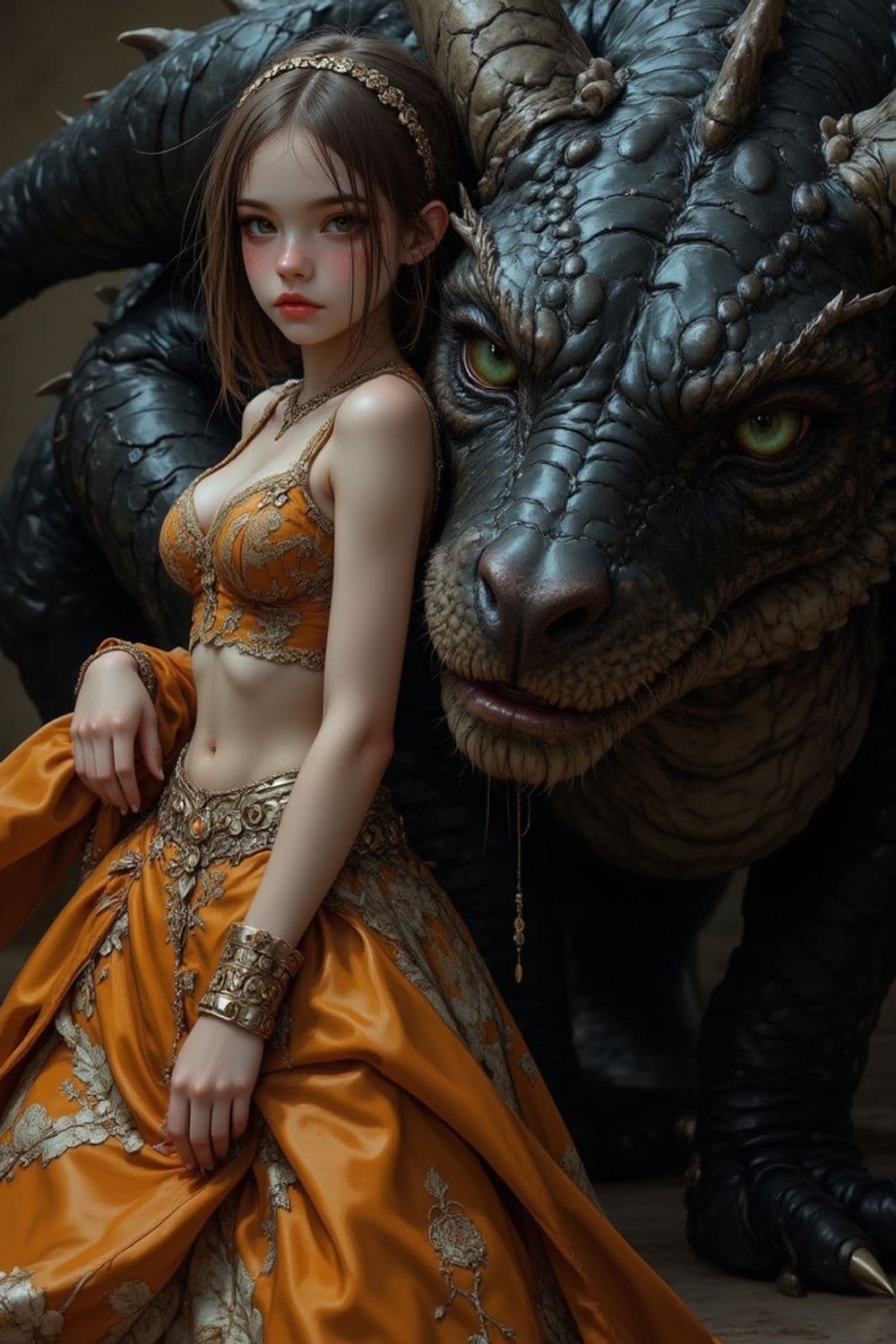 A young woman stands gracefully next to a large, majestic dragon. She wears an ornate orange gown with intricate gold patterns, her arm adorned with a wide, gold bracelet. Her hair is styled with a delicate gold headband. The dragon, with its textured dark scales and piercing green eyes, exudes a protective aura towards her.