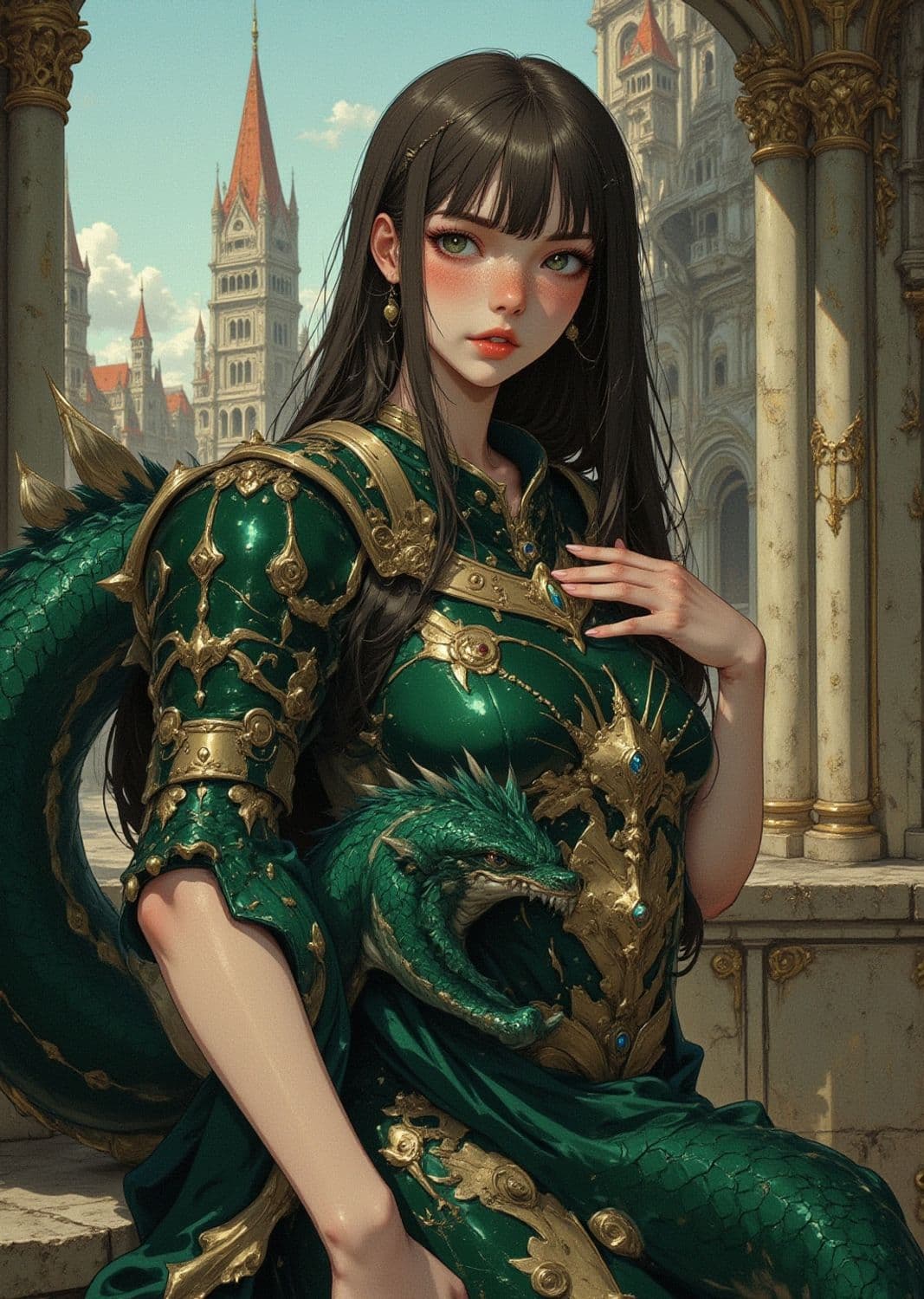 A fantasy illustration featuring a woman with long dark hair and an armored outfit adorned with ornate gold designs. She is accompanied by a green dragon intertwined with her armor. In the background, a medieval-style cityscape with towering buildings and pointed spires is visible, lending an air of an ancient, mythical setting.