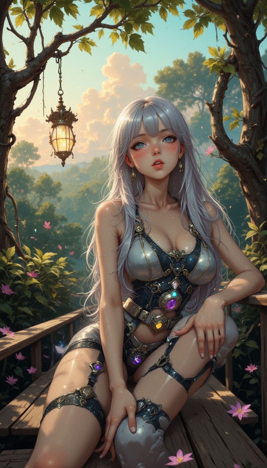 A mystical figure with long silvery hair, adorned in a metallic outfit featuring intricate designs and gemstones, sits on a wooden structure surrounded by lush trees and pink flowers. A lantern hangs from a nearby branch, casting a soft glow in the serene, sunlit forest scene.