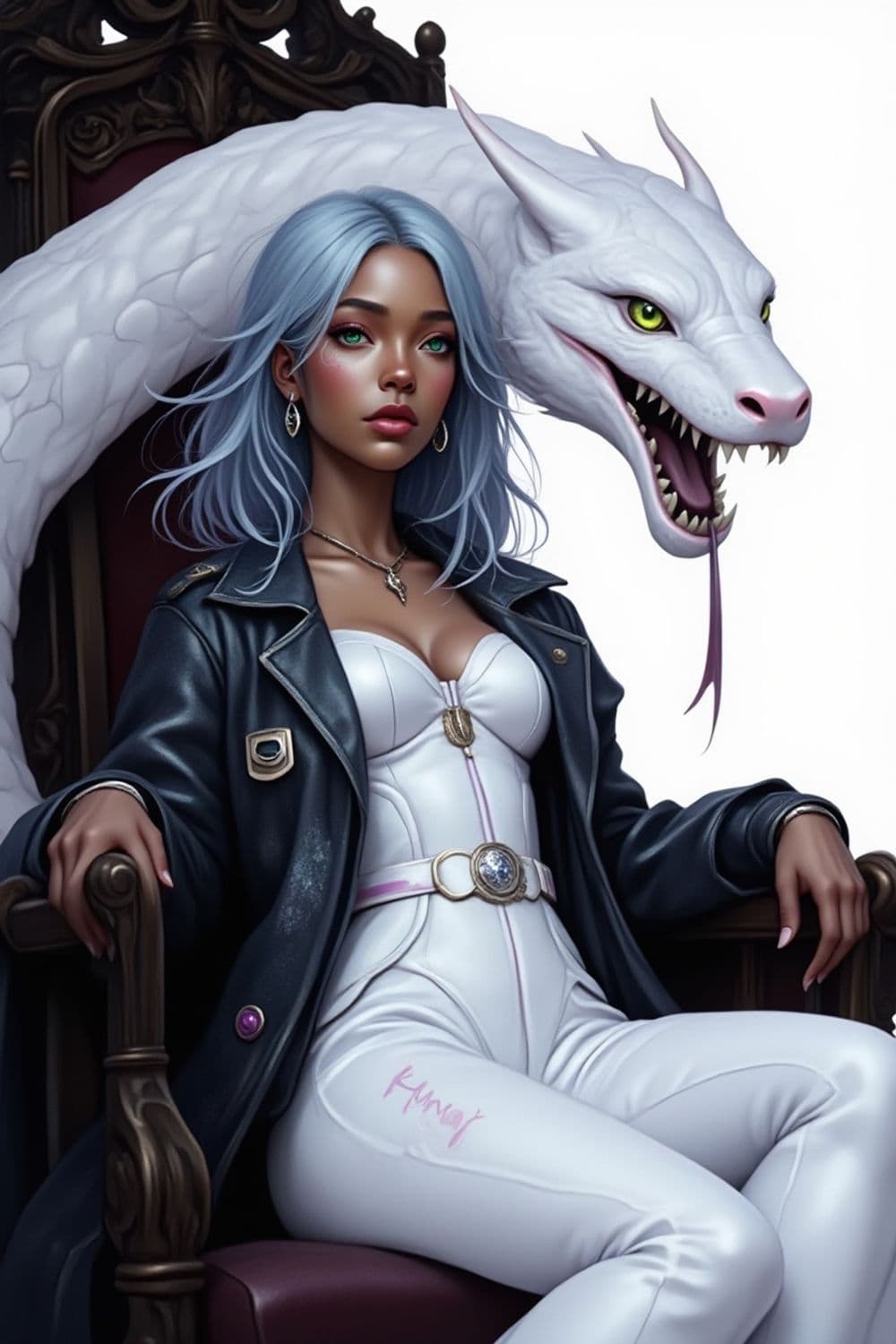 A striking character with light blue hair, seated on an ornately carved chair, she exudes an air of confidence. She wears a sleek white outfit paired with a black leather jacket, accessorizing with earrings and a necklace. A white dragon wraps around the chair, showcasing its vivid green eyes and a fierce expression.