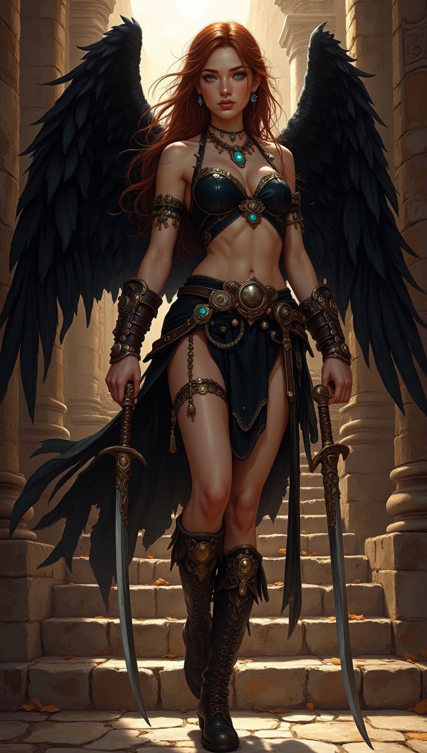 A fantasy scene featuring a fierce warrior with long red hair and striking black wings. She wears intricate, ornate armor adorned with turquoise gems and holds two curved swords. The backdrop is a stone staircase bathed in soft, warm light, suggesting a mythical setting.
