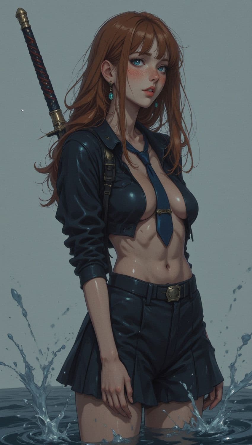 The image depicts a young woman with long auburn hair, standing in water. She wears a dark navy outfit consisting of a button-up shirt and shorts. The shirt is open, revealing a muscular physique, and she sports a blue tie. Her expression is intense yet calm, and she is adorned with teal drop earrings. A katana with a detailed hilt is slung across her back, suggesting readiness for action.