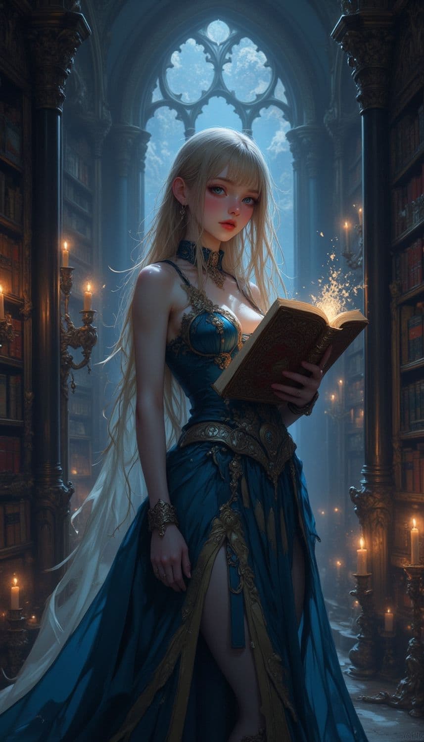 A mystical enchantress stands in an ancient library, illuminated by candlelight. She wears an ornate, blue dress adorned with gold accents. Her long, flowing blonde hair cascades down her shoulders. She holds an open book from which sparks of light emanate, indicating a magical presence. The background features tall, arched windows and towering bookshelves filled with ancient tomes.
