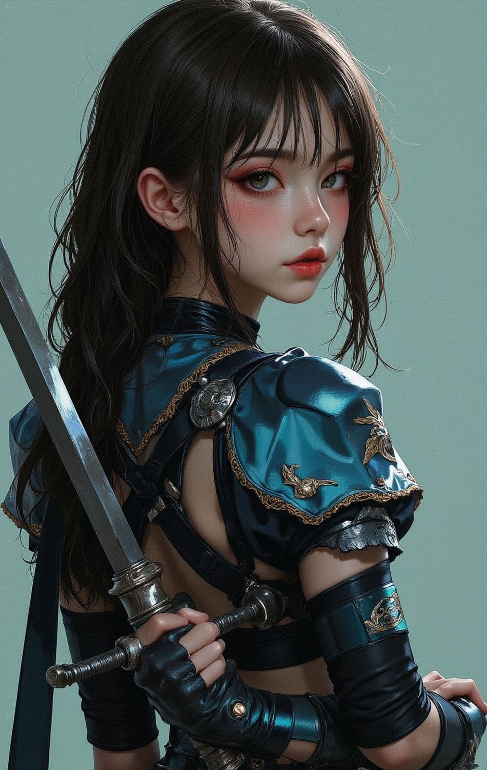 A young warrior with long dark hair stands confidently, holding a sword with both hands. She wears a striking blue and gold armor with intricate designs. Her gaze is intense, her cheeks are subtly flushed, and she exudes an air of determination and grace.