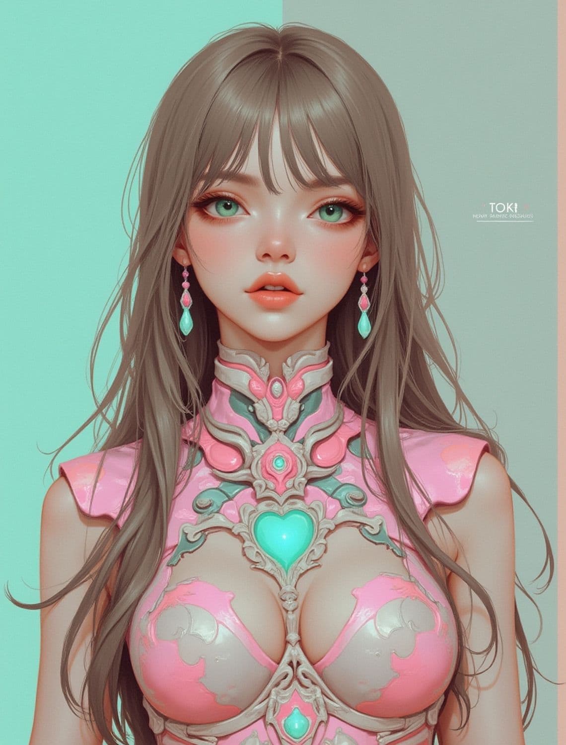 The image features a digital artwork of a young woman with long, flowing brown hair and striking green eyes. She is wearing an intricately designed, armored top with heart and gem motifs in shades of pink and teal. Her expression is serene, drawing focus to her delicate features and the elaborate details of her attire. The background is split into two contrasting colors, mint green and light pink, enhancing the vividness of her outfit.