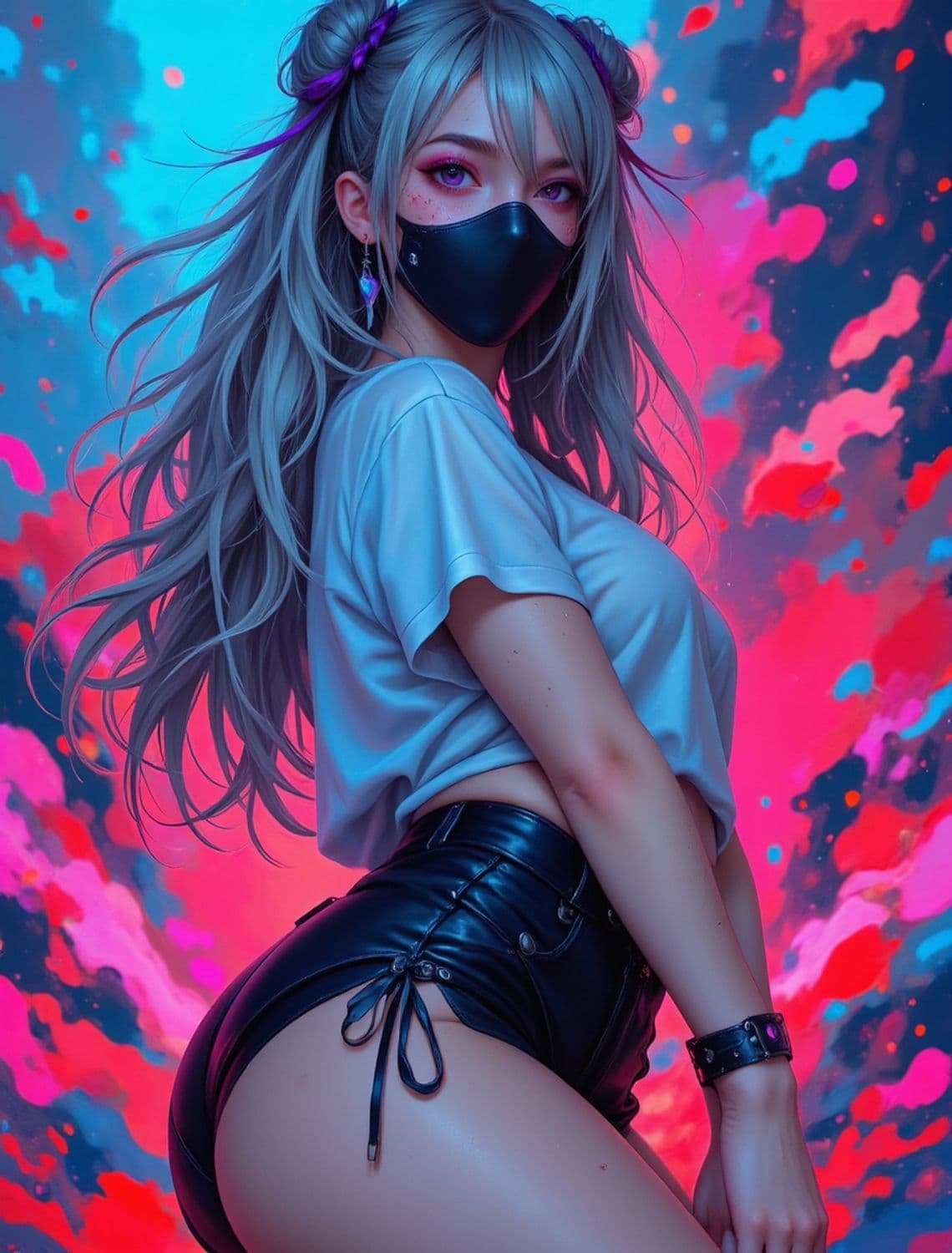 A digitally illustrated character with long, flowing silver hair and purple highlights, wearing a black face mask. She has a confident stance, adorned in a white t-shirt and black leather shorts. The background is a vibrant explosion of pink, blue, and red colors creating a dynamic and vivid atmosphere.