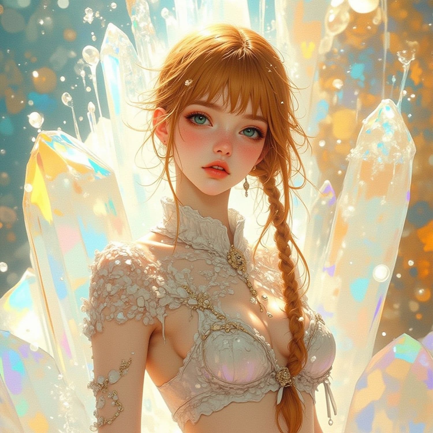 A mesmerizing image of a young woman with an ethereal appearance is depicted. She stands against a backdrop of luminous crystals that emit a soft, multicolored glow. Her hair is styled in a long braid, adorned with delicate accessories that twinkle in the light. She wears an intricately detailed top with lace and jeweled embellishments that add to her enchanting aura. Her facial features are finely drawn, with captivating eyes and a serene expression.