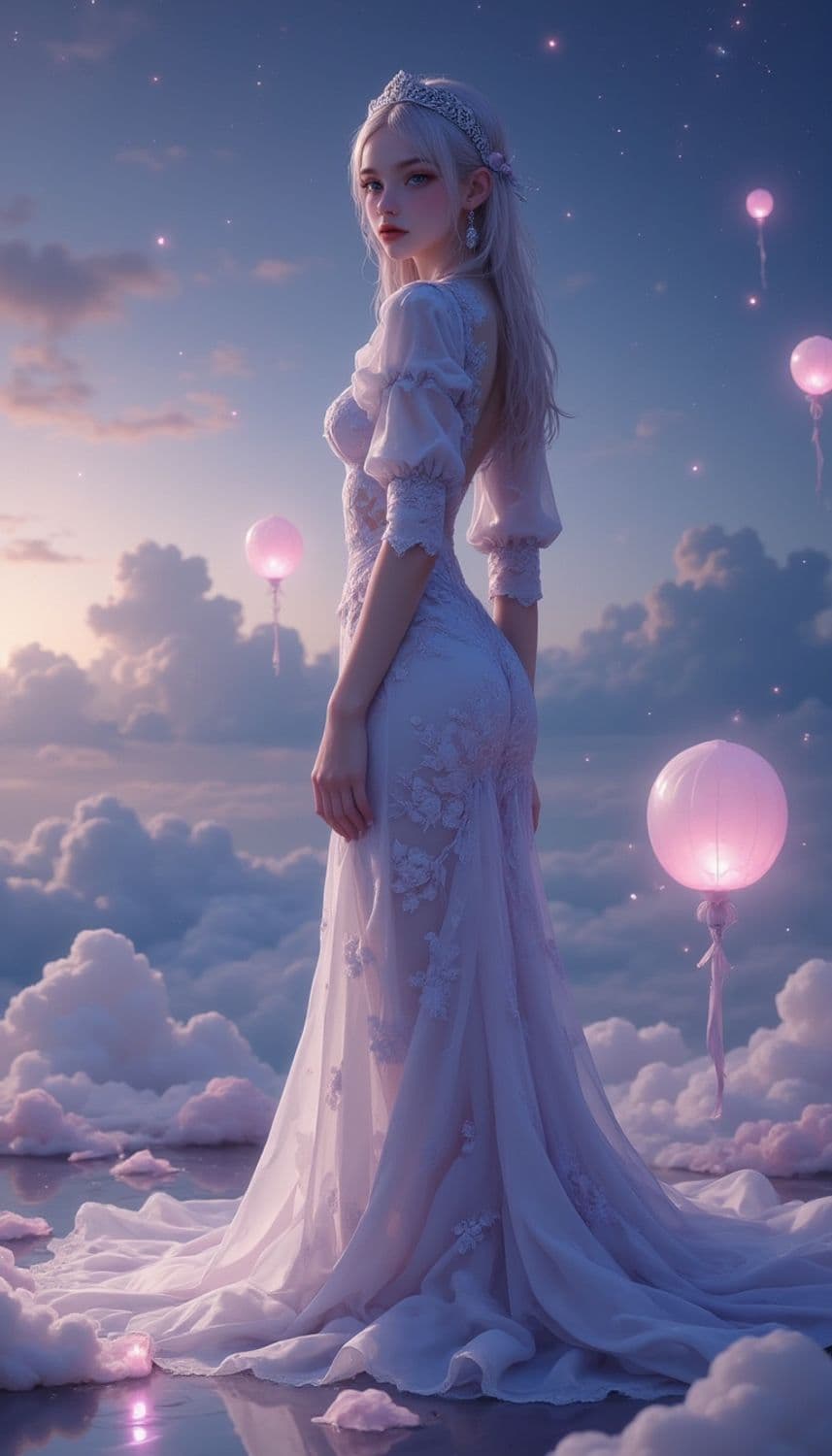 In a dreamlike setting, a woman stands gracefully amidst a field of fluffy clouds and soft pink balloons. Her long, flowing dress adorned with delicate floral patterns drapes elegantly to the ground. She gazes back with a serene expression, framed by a delicate tiara and earrings that match the ethereal atmosphere. The sky is a dreamy gradient from pink to purple, speckled with tiny, glowing stars and misty clouds, creating an enchanting, surreal environment.