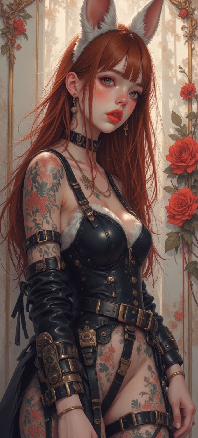 The image depicts a woman with long red hair, adorned with bunny ears. She is wearing a black leather outfit with intricate straps and golden embellishments. Her skin features detailed tattoos of roses, and she stands against a wallpaper with floral patterns.
