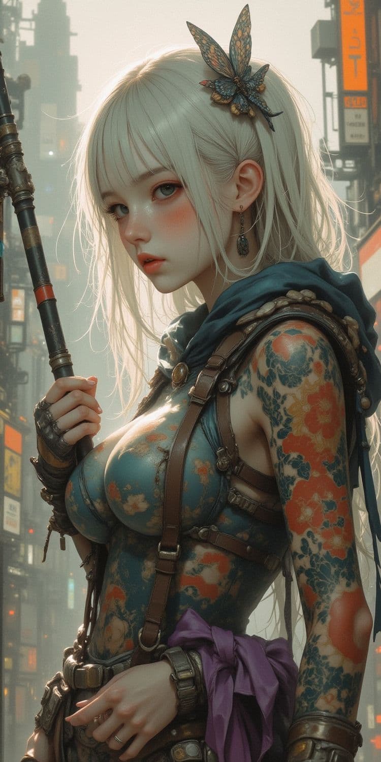 A futuristic warrior stands confidently against a backdrop of towering cityscapes with neon signs. She has long platinum hair, adorned with a large butterfly ornament. Her attire is a blend of modern armor and intricate tattoos, covering her arms with vibrant floral patterns. Her expressive gaze and modern garb hint at a world that merges the natural with the technological.