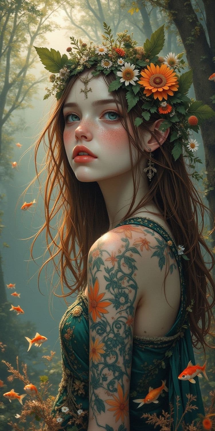 A mystical forest scene features a young woman with long, flowing hair adorned with a crown of various flowers and leaves. Her gaze is captivating, and her complexion is softly highlighted by gentle light filtering through the trees. She wears a garment decorated with floral designs, and her arm is beautifully tattooed with intricate flower motifs. Small goldfish swim gracefully around her, adding a whimsical touch to the forest setting.