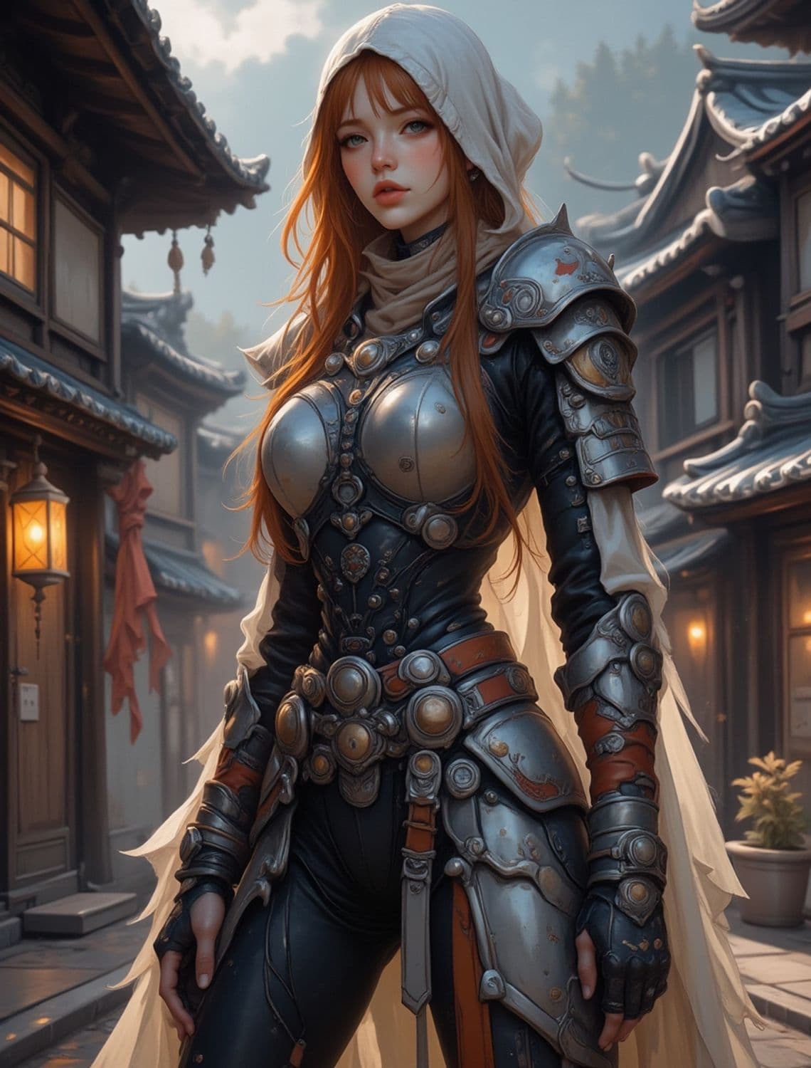 A captivating female warrior stands in an ancient Japanese-style village. She wears intricately designed silver armor with a rich assortment of textures, including leather and metal, complemented by a flowing white hood and cape. Her long, auburn hair cascades elegantly, and she gazes forward with a determined expression. The village around her, with its traditional wooden structures and warm lantern lighting, evokes a timeless, mystical atmosphere.