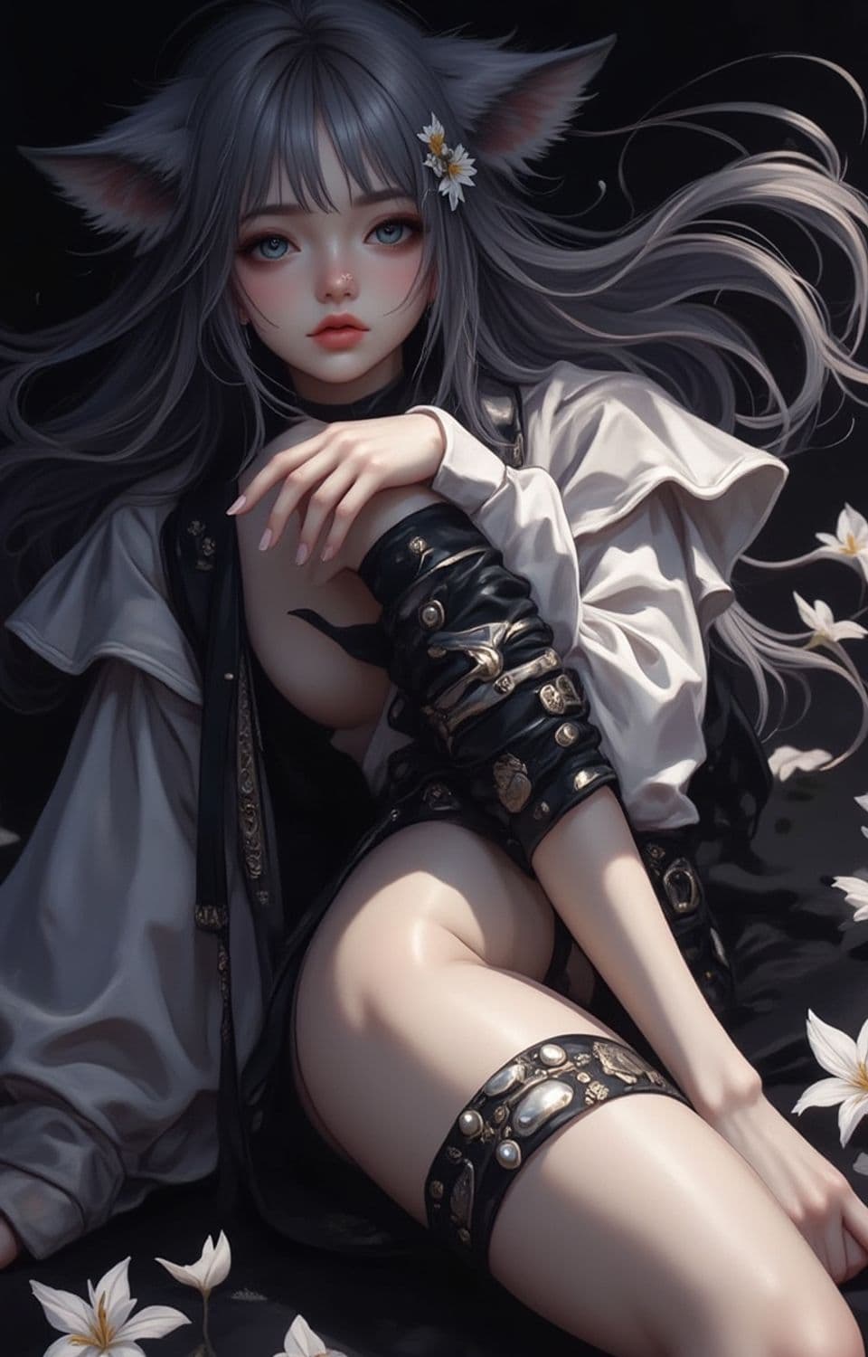 A mystical female character with cat-like ears and long, flowing silver hair adorned with a daisy. Her attire is a mix of black leather with ornate embellishments and a white flowing top. She has a serene expression and soft flushed cheeks, with delicate flowers surrounding her, set against a dark, ethereal background.