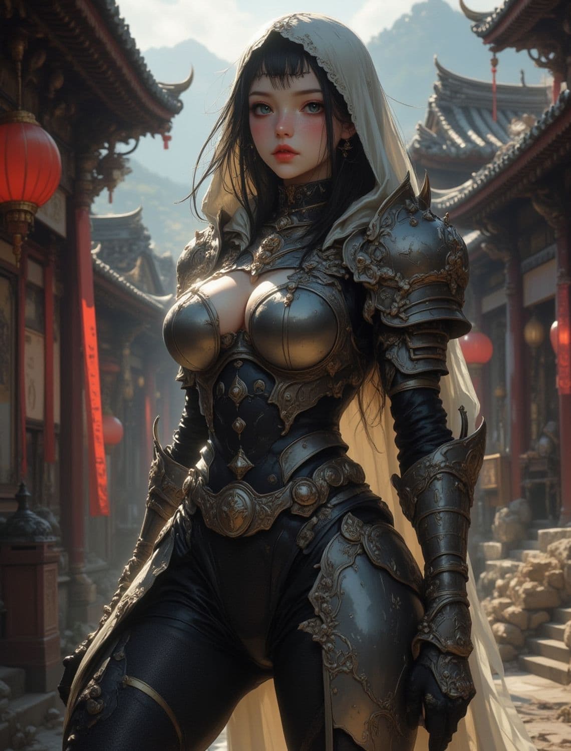 A warrior in ornate, medieval-inspired armor stands confidently in an ancient, temple-lined street under a clear sky. Her armor is intricately detailed with gold embellishments, and she wears a shawl draped over her head. Red lanterns hang from the traditional architecture in the background, enhancing the historical ambiance.
