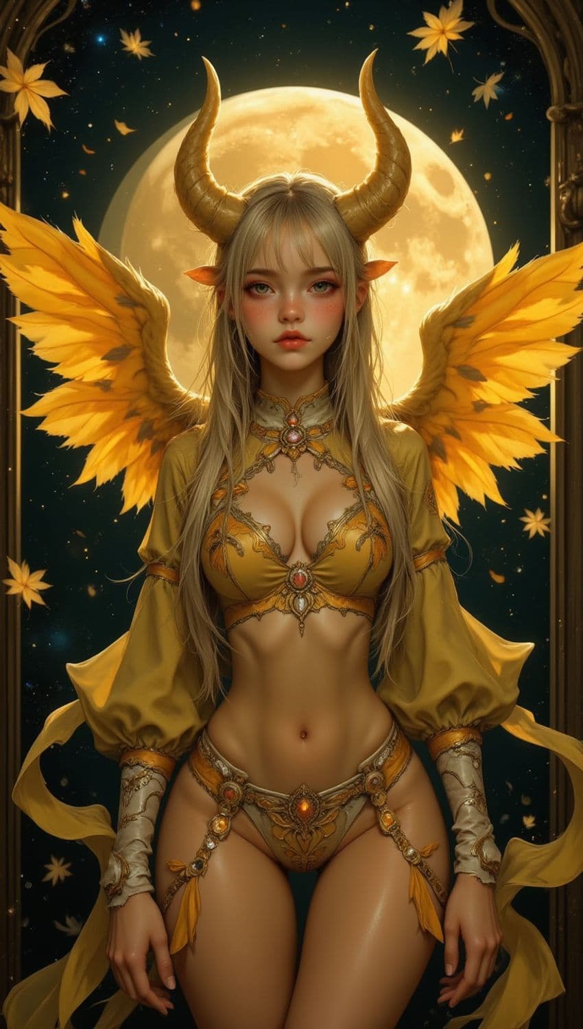A mystical figure stands against a backdrop of a glowing full moon, surrounded by floating autumn leaves. She has golden horns, bright yellow wings, and elongated pointed ears. Her outfit consists of intricately designed golden armor that complements her ethereal appearance.