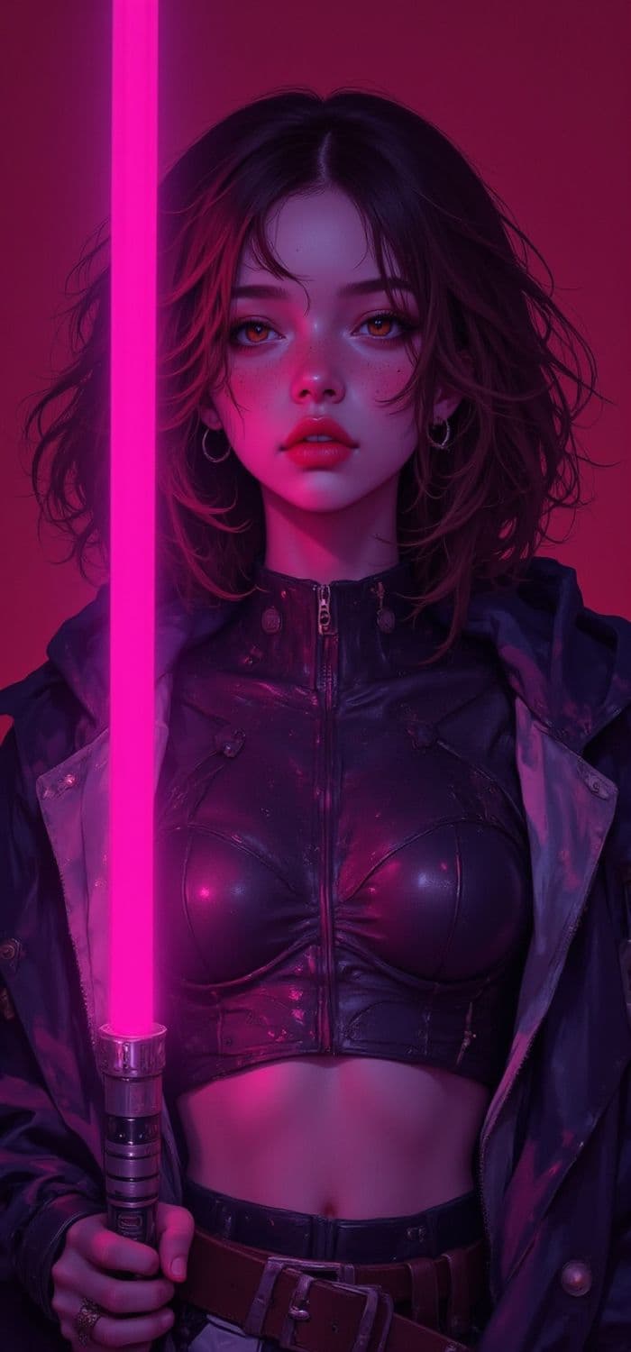 A striking digital artwork featuring a young woman with short, wavy hair holding a glowing pink lightsaber. Her intense gaze is complemented by her vivid eye makeup and natural freckles. She wears a form-fitting black leather jacket over a crop top, highlighted by a deep pink and red lighting ambiance that adds a dramatic flair to the scene.