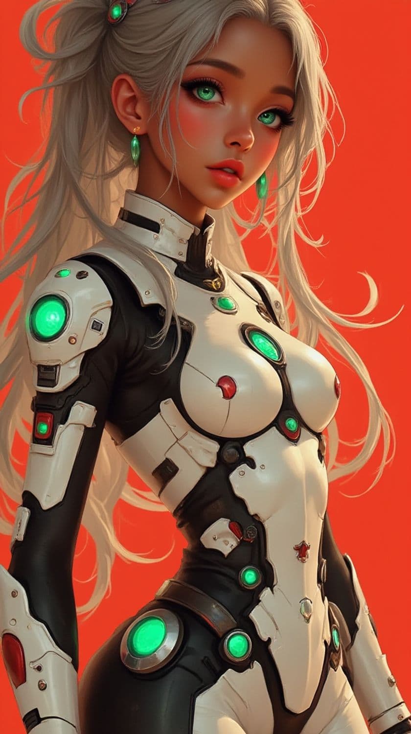 The image features a futuristic female character with striking green eyes and long, flowing silver hair. She wears a sleek, form-fitting armored suit adorned with glowing green and red elements, suggesting advanced technology. The bright orange background accentuates her features and the intricate design of her suit.