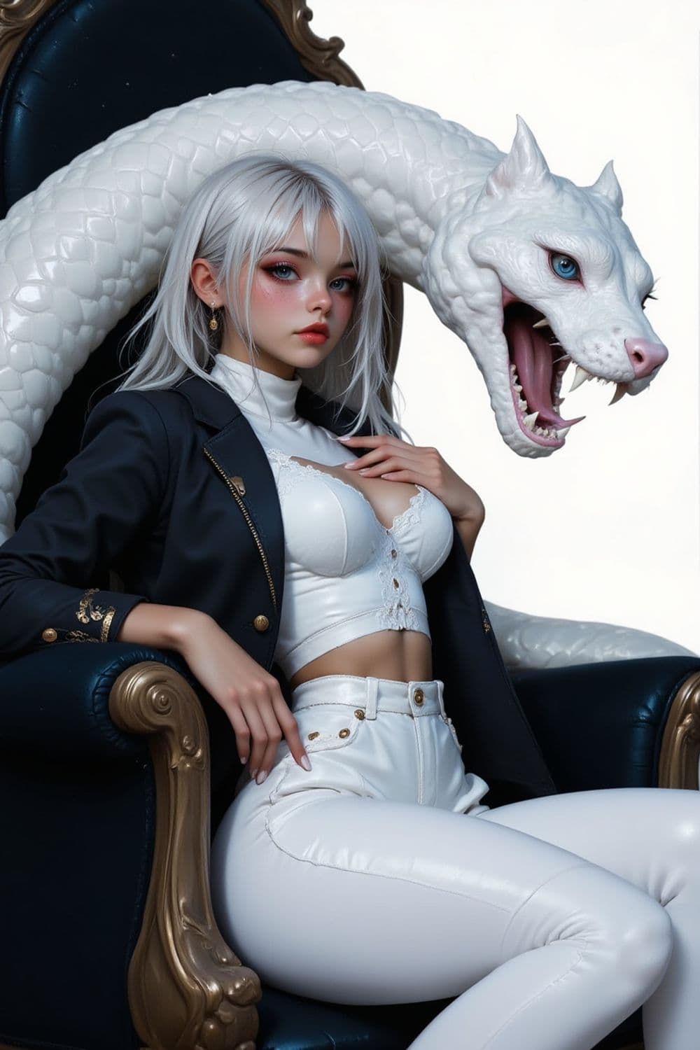 A striking portrait of a young woman with long white hair, dressed elegantly in a black blazer with gold detailing and a white lace top. She is seated confidently in a vintage, ornate chair with a dark blue velvet finish and gold embellishments. A large, mysterious white serpent with fierce blue eyes and an open mouth is coiled around the chair, adding a fantastical element.