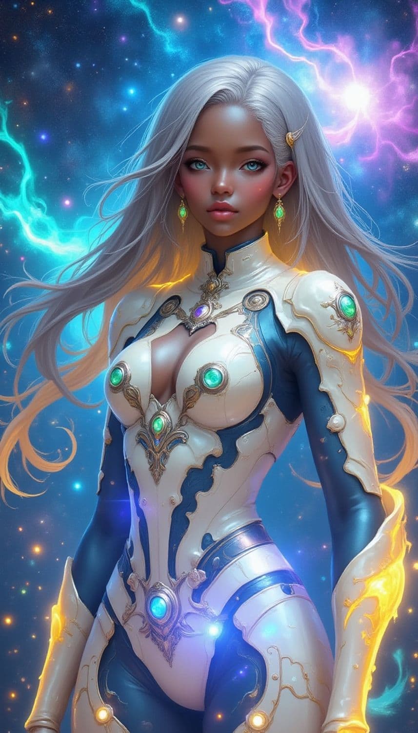 A mesmerizing celestial figure with long silver hair and striking blue eyes stands against a cosmic backdrop filled with vibrant nebulae and stars. Her futuristic armor glows with embedded jewels in various colors, adding an ethereal aura.