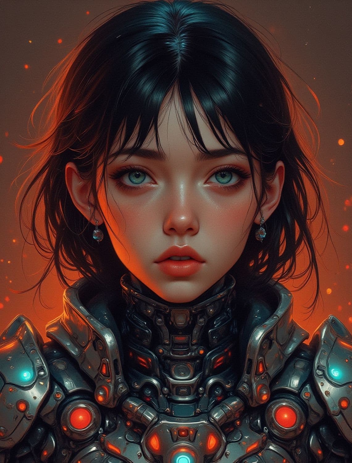 A young woman with striking green eyes and black hair is depicted in a futuristic setting. She wears ornate sci-fi armor with glowing red and blue accents. The image has a warm, glowing ambiance with sparks floating around.