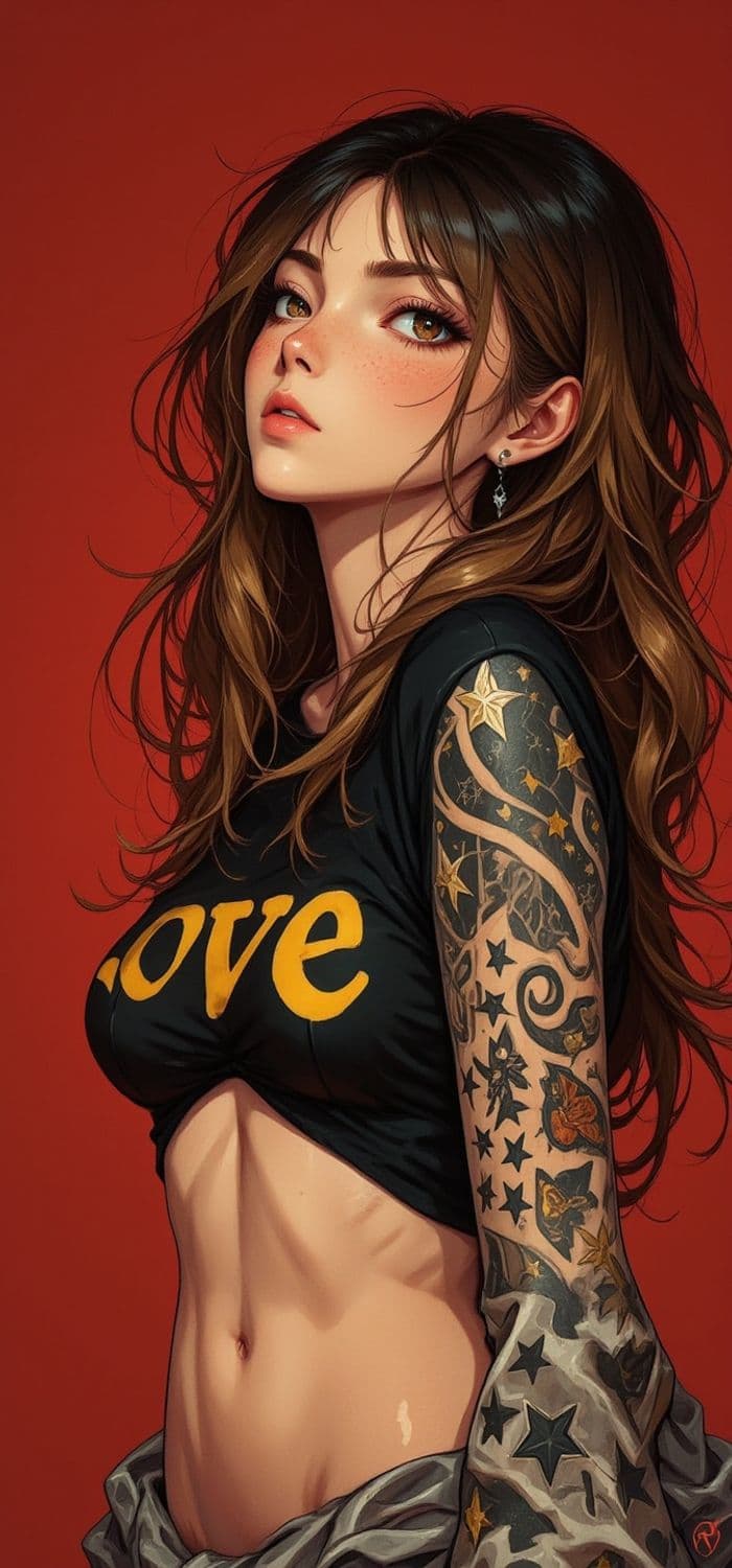 A digital artwork of a young woman with long, wavy brown hair cascading over her shoulders. She has a confident gaze and is wearing a black crop top with the word 'love' in bold yellow letters. Her right arm is adorned with an elaborate tattoo featuring stars and butterflies, extending down to her wrist. The background is a solid, warm red that accentuates her expressive look and detailed tattoos.