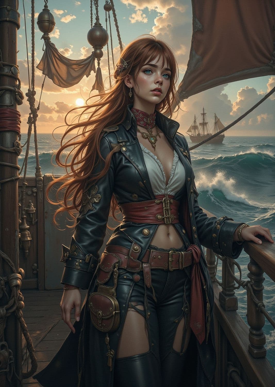 A striking image of a woman standing confidently on a ship's deck, with flowing hair and a determined look. She is dressed in a detailed leather outfit adorned with intricate patterns, buckles, and accessories that evoke a pirate or adventurer theme. The background showcases a vibrant ocean with waves crashing against the ship, while another vessel sails in the distance under a dramatic sky filled with clouds illuminated by the setting sun.
