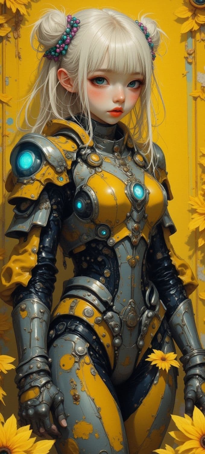 A digital artwork of a young woman with pale white hair styled in two buns, adorned with colorful beads. She is wearing a futuristic armor in yellow and gray with glowing blue lights. Her backdrop is a vivid yellow with sunflowers, complementing her detailed armor.
