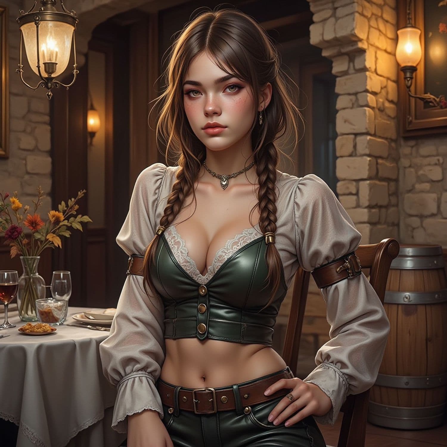 A young woman is seated in a rustic, warmly lit interior. She has long brown hair styled in braids and is wearing a leather vest over a lacy blouse, accessorized with a necklace and armbands. The background features a stone wall, soft lighting from lamps, and a table set with wine glasses and flowers. The setting has a cozy, medieval tavern ambiance.