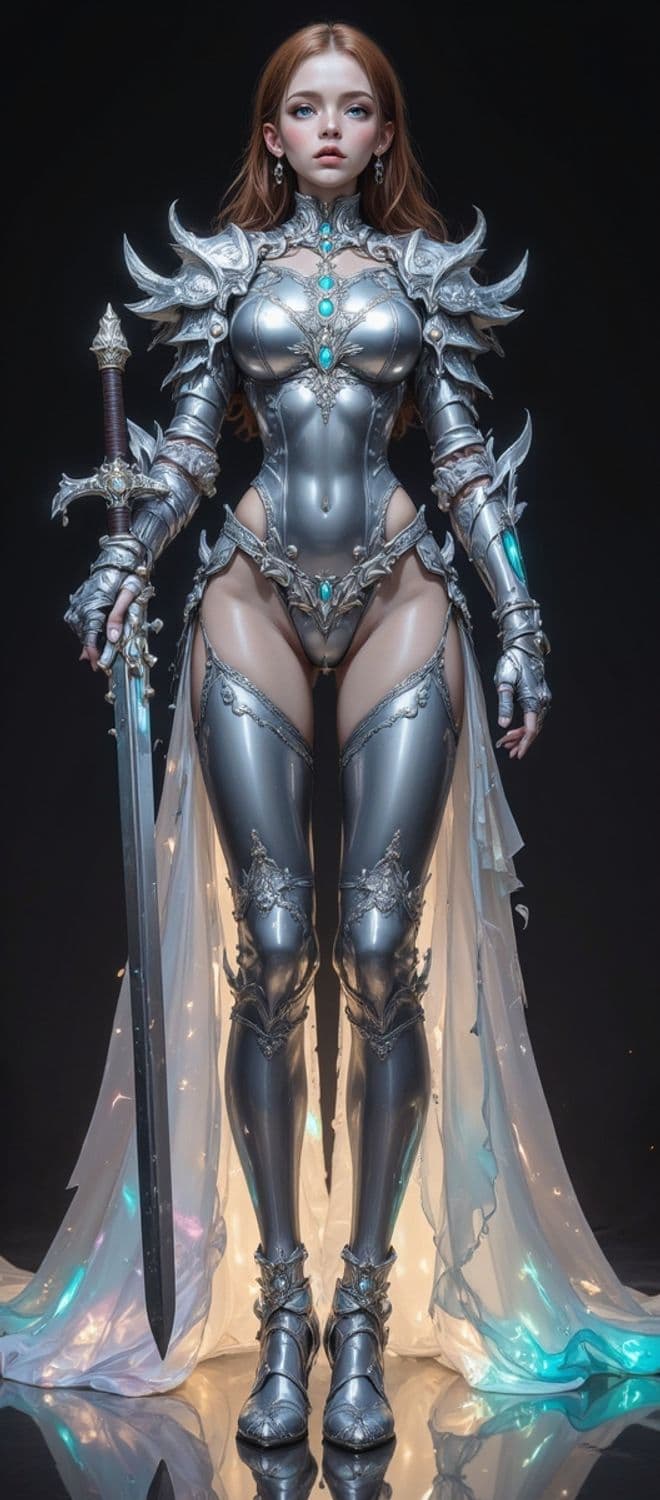 An armored female warrior stands confidently, clad in intricate silver armor adorned with glowing blue gemstones. She holds a sword upright, with an ethereal aura surrounding her, illuminated by a flowing cape that shimmers in the light. Her expression is determined, with long auburn hair cascading down her shoulders.