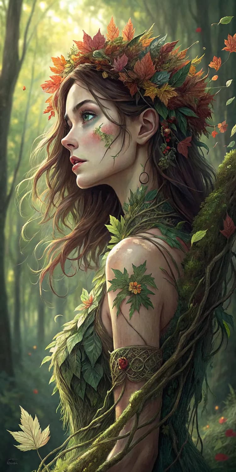 An enchanting digital painting of a forest nymph, embodying the spirit of nature. She is adorned with a crown of vibrant autumn leaves and delicate vines that wrap around her arms. Her dress is woven from petals and moss, blending seamlessly with the forest surroundings. Her hair is a deep chestnut, flowing freely with the wind, and her eyes are the color of emerald, full of wisdom and mystery. The background is a lush, green forest with dappled sunlight filtering through the trees.