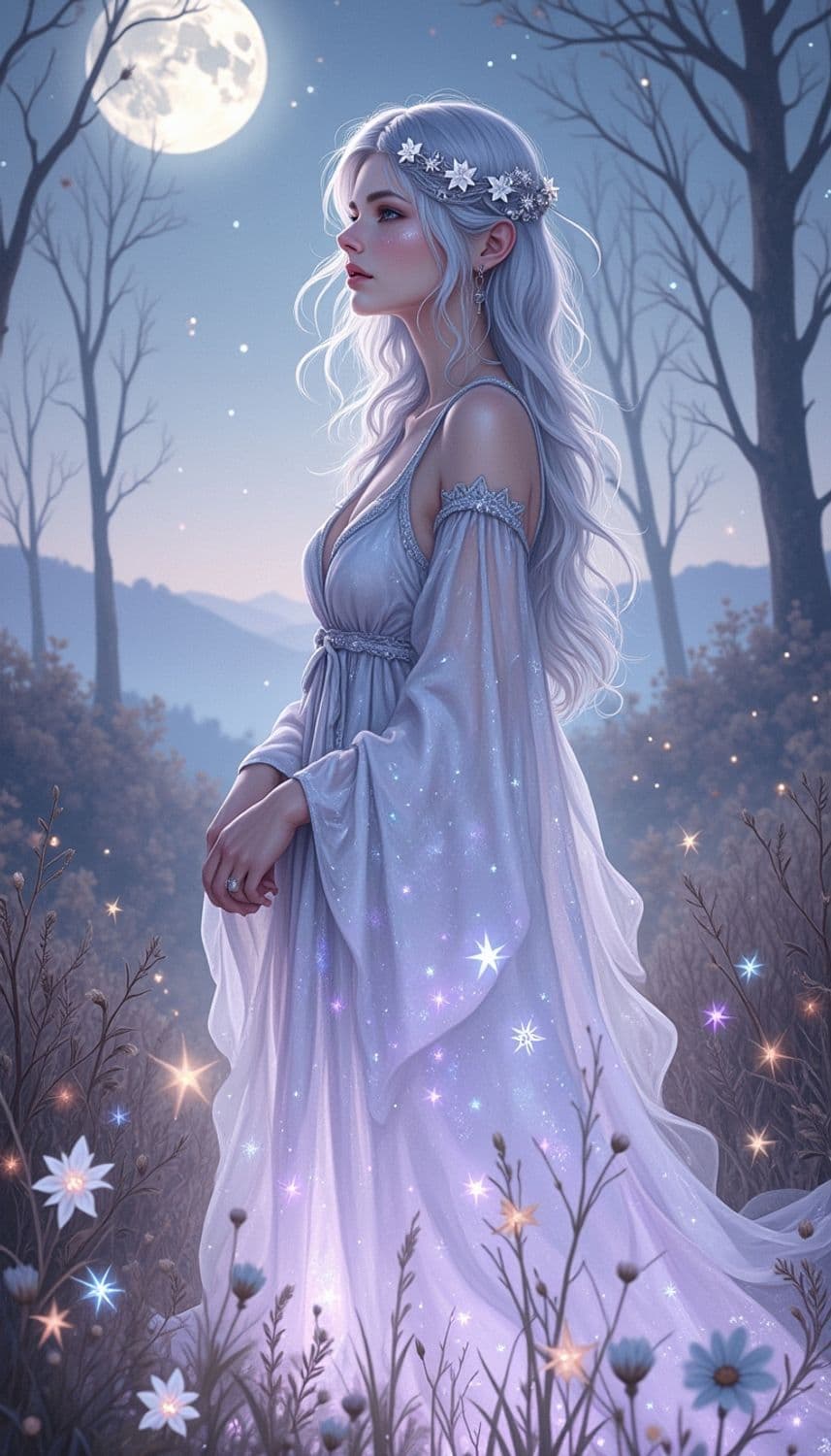 In a mystical, ethereal meadow bathed in the soft glow of moonlight, a captivating female figure stands amidst a sea of gently swaying, luminescent grasses and delicate, glowing fireflies. Her attire is a flowing gown crafted from a fabric that seems to capture the essence of moonbeams, blending shades of pale silver and soft lavender. Her hair, a striking shade of starlit silver, cascades down her back in intricate, celestial waves, framing a face with delicate, serene features. Her eyes, a mesmerizing shade of moonlit blue, seem to reflect the tranquil beauty of the night sky. She wears a delicate headpiece made of intertwining moonflowers and tiny, twinkling crystals, enhancing her mystical and otherworldly presence. The background is a breathtaking scene of ancient trees silhouetted against a star-studded sky, creating a serene and enchanting atmosphere. The style is a blend of fantasy and celestial elegance, with a focus on cool color tones and intricate detailing, creating a mesmerizing and otherworldly atmosphere.