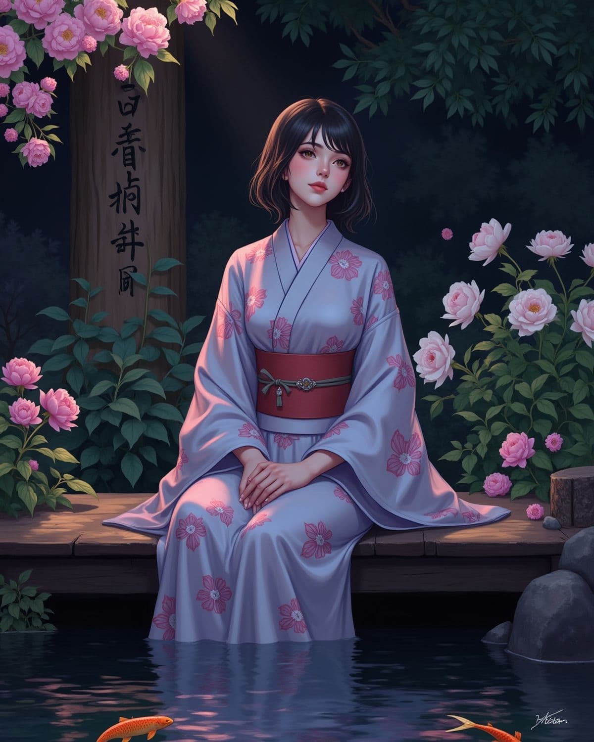 A serene moment by the pond: A woman in a traditional kimono sits surrounded by blooming pink flowers.