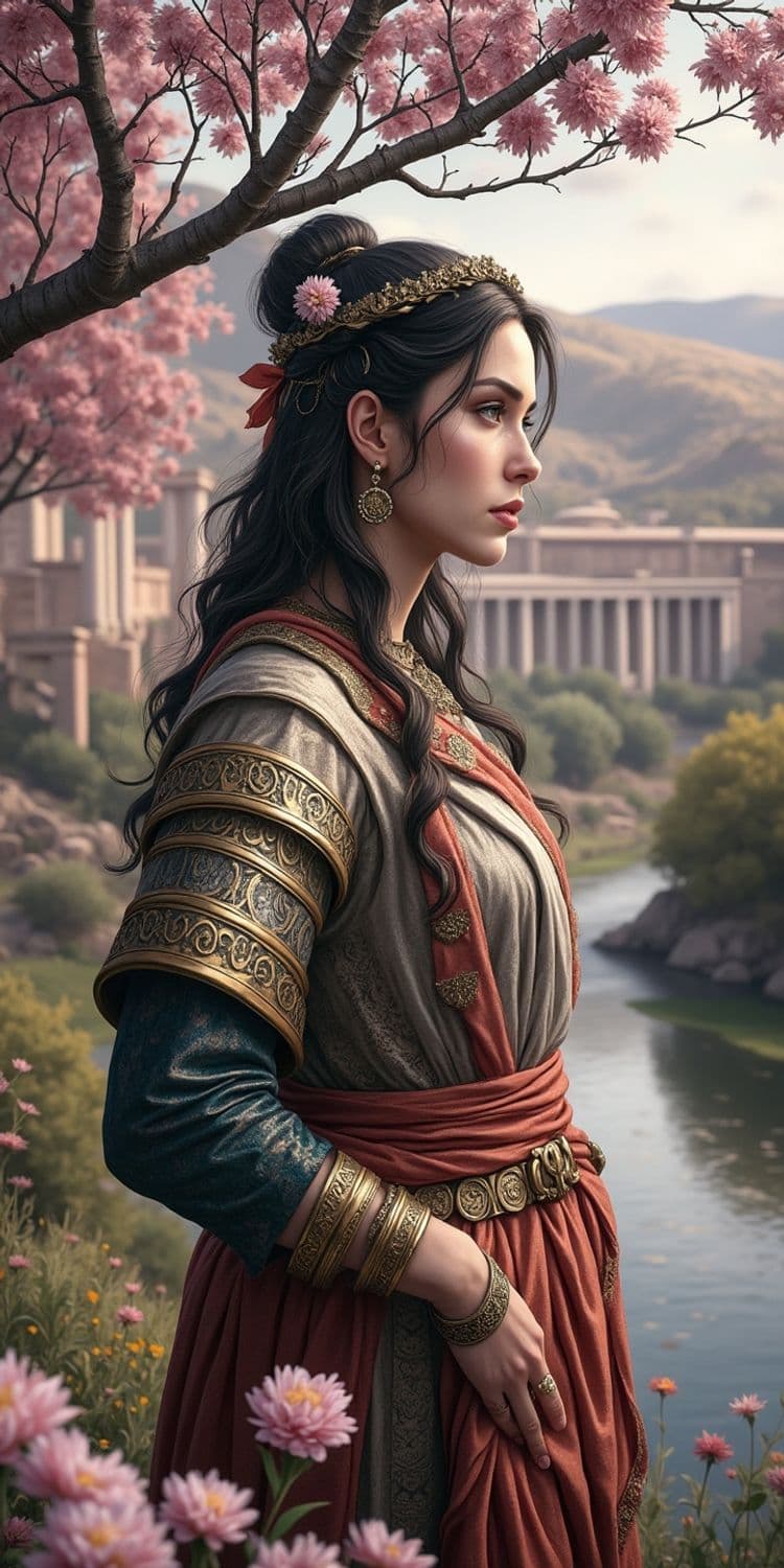 The image depicts a classical-style portrait of a woman set in a serene outdoor environment. She is standing sideways, facing to the right against the backdrop of a river and distant classical architecture resembling ancient Roman or Greek buildings. The woman has long, wavy black hair, adorned with a golden floral headdress and a pink flower. She is dressed in a richly detailed, flowing garment composed of layers in shades of gold, teal, and deep reddish-orange. Her dress is decorated with ornate, metallic designs, particularly on the arm cuffs and belt, indicating a regal or noble status. Her jewelry includes elaborate gold earrings and multiple bracelets. The setting includes a lush landscape with pink cherry blossoms overhead and delicate pink flowers in the foreground. The color palette is a harmonious blend of soft pastels and warm earth tones, complementing the tranquil and classical aesthetic of the composition.
