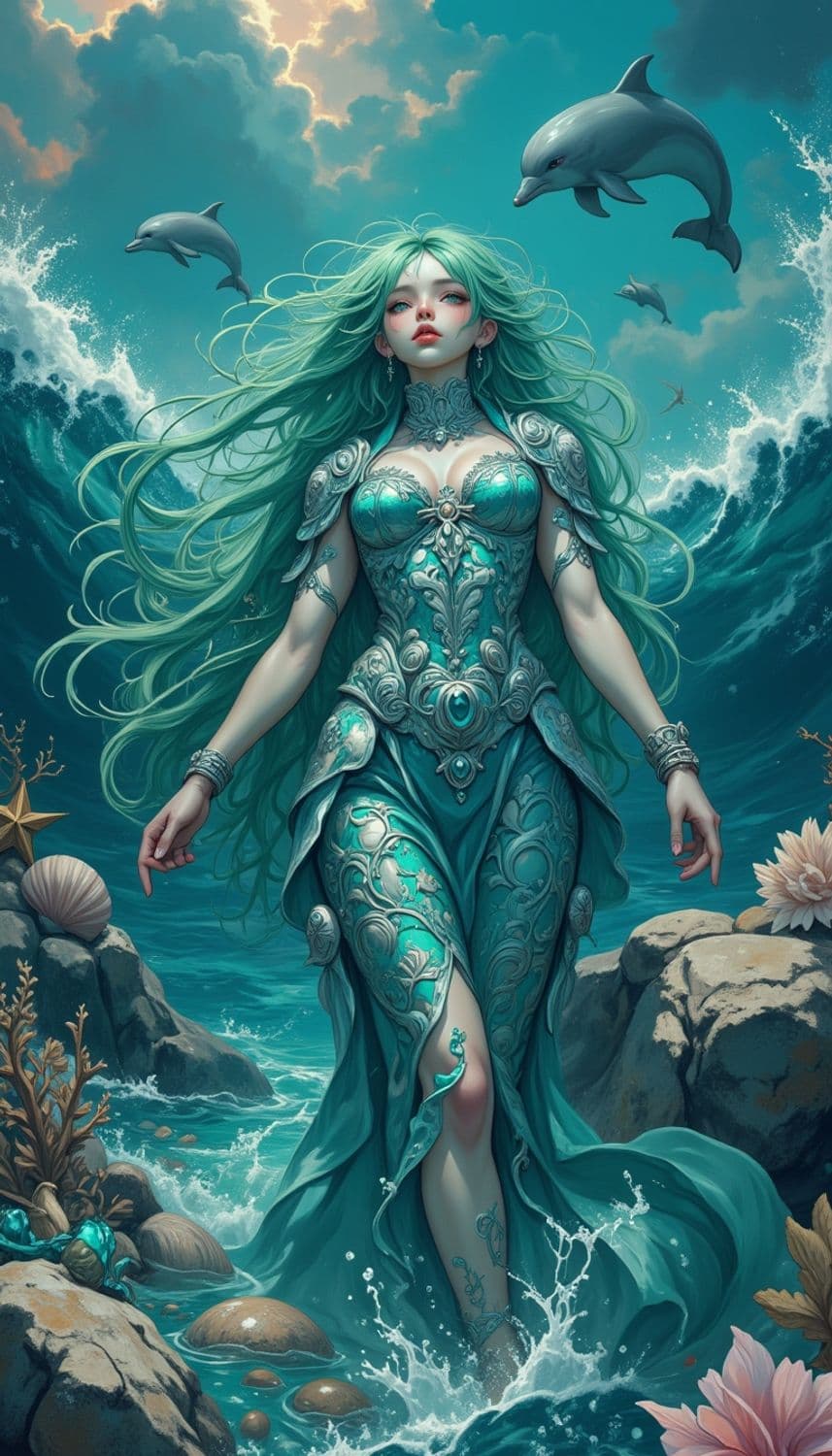 A mystical figure stands amidst the ocean waves, adorned in intricately designed teal armor that mimics the flow of the sea. Her long, flowing green hair complements the vibrant oceanic backdrop. Dolphins leap joyously in the air around her. The serene yet powerful scene evokes a sense of harmony between the guardian and her marine environment, highlighted by the soft glow of sunlight piercing through clouds.