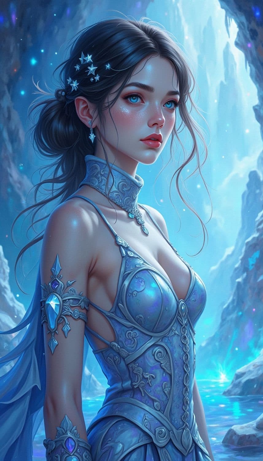 In a mystical, otherworldly realm, a captivating female figure stands amidst a breathtaking crystal cave, where the walls shimmer with iridescent hues of blue and violet. Her attire is a stunning ensemble of a form-fitting bodice made from glistening, translucent material, adorned with intricate patterns resembling frost. Flowing from her waist is a sheer, ethereal skirt that seems to merge with the mist surrounding her feet. Her long, silvery hair cascades down her back, adorned with delicate, crystalline hairpieces that catch the light, creating a halo effect. Her eyes, a striking shade of icy blue, seem to hold the secrets of the universe. She wears elegant, icy arm cuffs and a necklace that glows softly, resonating with the ambient light of the cave. The atmosphere is serene yet enchanting, with the cave's natural luminescence casting a dreamlike glow over the entire scene. The style is a blend of fantasy and realism, with a focus on cool color tones and intricate detailing typical of digital fantasy art.