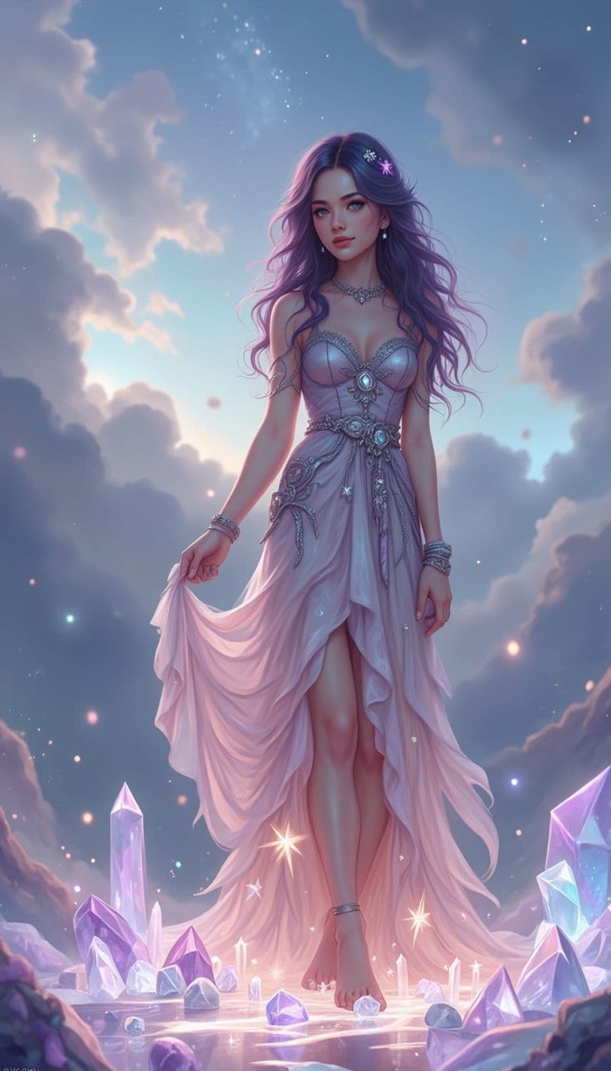 In a mystical, ethereal realm of floating, luminescent crystal caverns under a sky painted with the colors of a serene twilight, a captivating female figure stands poised on a shimmering, translucent crystal platform. Her attire is a flowing, elegant gown crafted from a fabric that seems to capture the essence of twilight magic, blending shades of deep amethyst and shimmering pearl. Her hair, a striking shade of twilight violet, cascades down her back in intricate, flowing waves, framing a face with delicate, serene features and a gentle, mysterious smile. Her eyes, a mesmerizing shade of twilight silver, seem to reflect the mysteries of the crystal world. She wears a delicate circlet adorned with tiny, luminescent crystal shards and silver filigree, enhancing her celestial and otherworldly presence. The background is a breathtaking scene of luminescent crystal caverns and gentle, glowing streams of twilight light that weave through the realm, creating a serene and enchanting atmosphere. The style is a blend of fantasy and crystal elegance, with a focus on cool color tones and intricate detailing, creating a mesmerizing and otherworldly atmosphere.