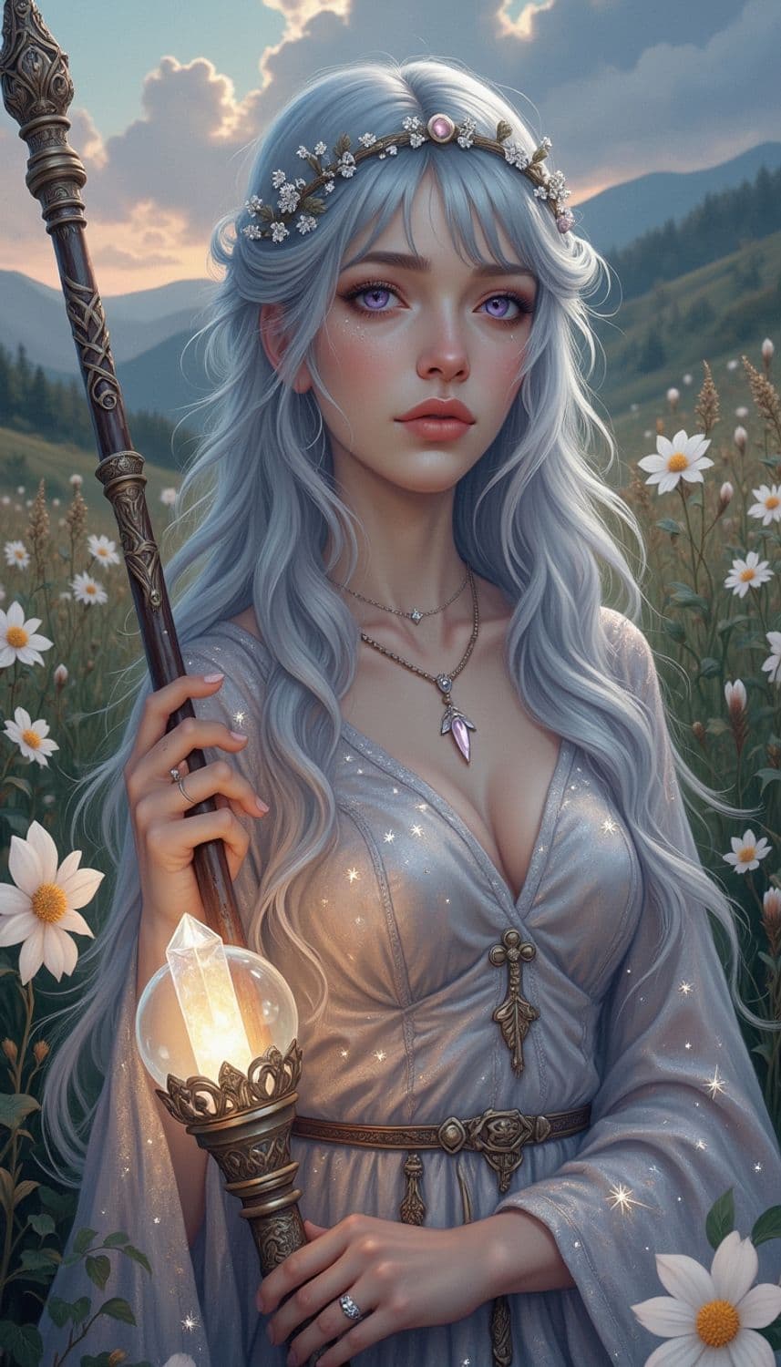A mystical woman stands in a field of daisies at sunset, holding an ornate staff with a glowing crystal orb. She has long silver hair adorned with a floral crown and wears a shimmering, ethereal gown. Her expression is serene, and the mountains are silhouetted against a cloudy sky in the background.