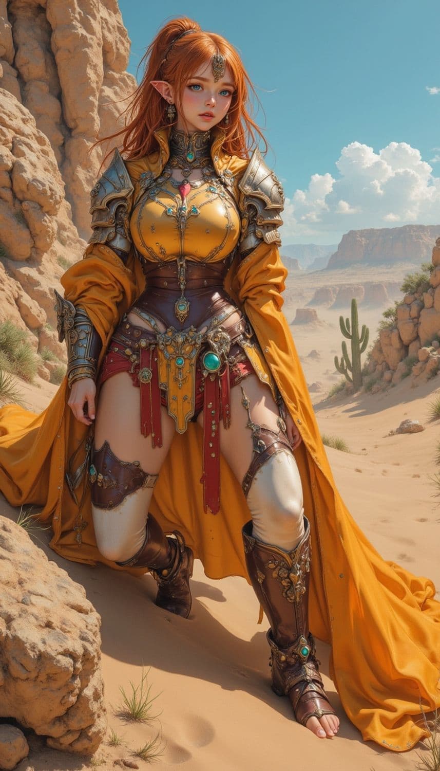 A fantasy warrior stands in a sunlit desert with dramatic rock formations and cacti. She has pointed elf-like ears and vibrant orange hair tied up. Her armor has intricate designs, featuring metallic elements and gemstones, with a flowing yellow cape. The sky is clear with a few fluffy clouds adding to the serene yet adventurous atmosphere.