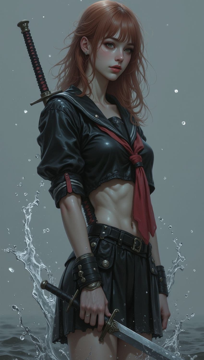A striking illustration of a fierce young woman standing confidently with a sword in her hand. She has long reddish-brown hair and wears a black cropped sailor-style top with a red tie and a high-waisted black skirt adorned with buckles. Her toned midriff is visible, showcasing her strong physique. A katana is slung across her back, and she stands amidst splashing water, adding dynamic energy to the scene. The background is a muted gray, highlighting her determined expression and powerful stance.