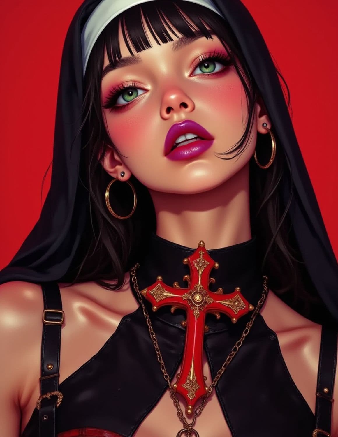 The image features a striking woman with vibrant green eyes and bold red lips. She wears a black headpiece with a white band, reminiscent of a nun's habit. Large hoop earrings adorn her ears, and she showcases a dramatic red cross pendant with gold details, suspended by a chain across her black outfit. The background is a vivid red, complementing the dramatic theme and color palette.