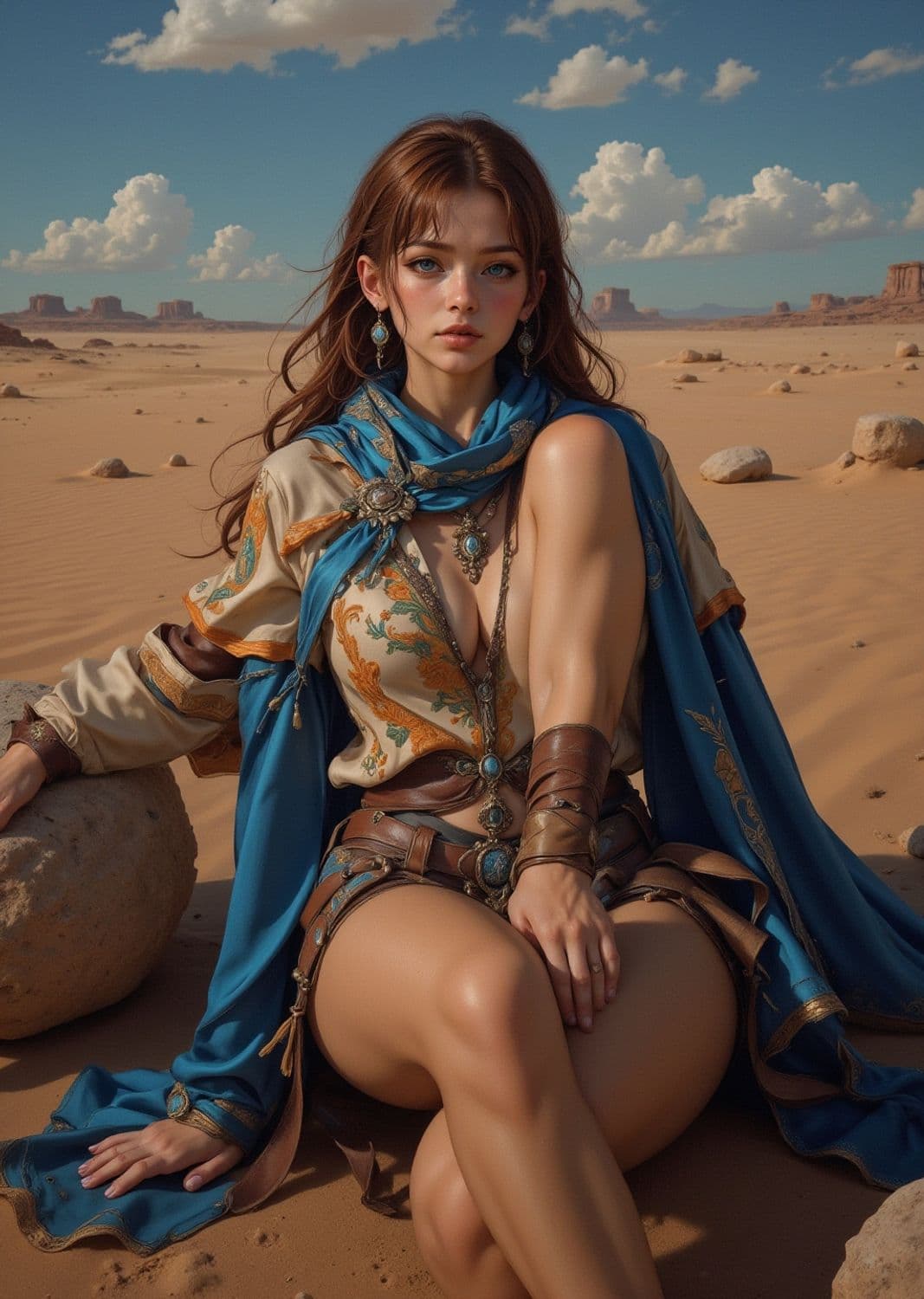 A young woman sits in a desert landscape. She has long brown hair and is wearing an ornate outfit with a blue scarf adorned with intricate patterns and jewelry. The sky is clear with scattered clouds and rock formations in the background.