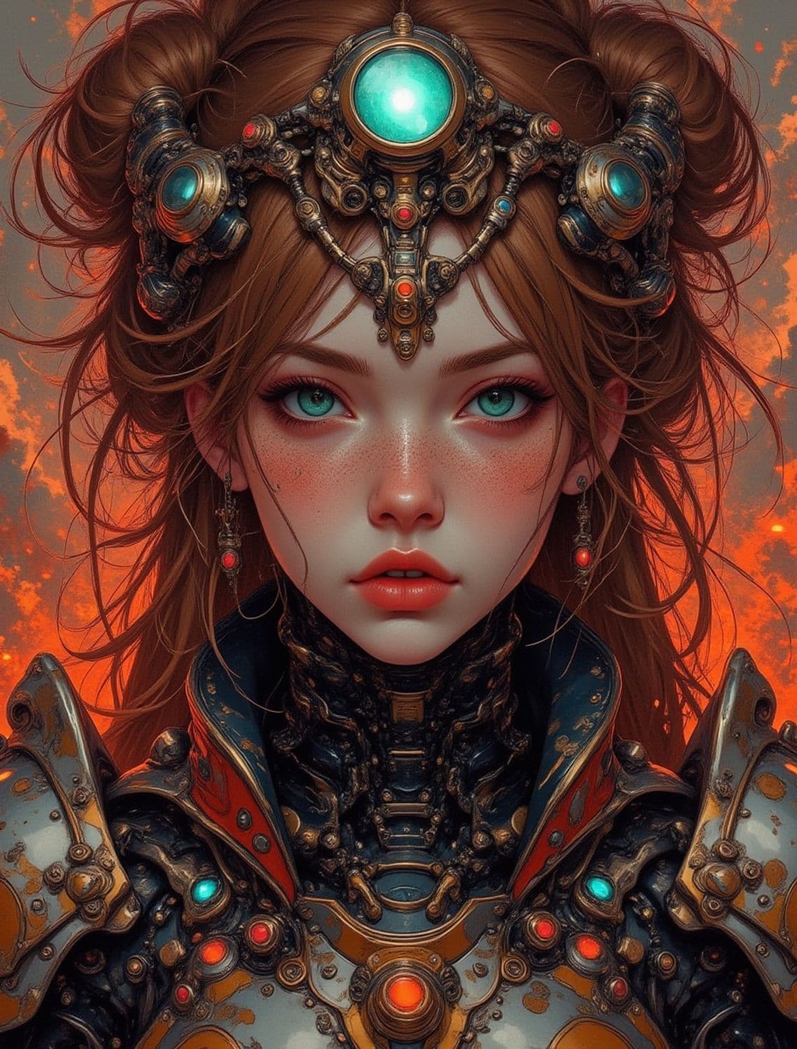 A striking portrait of a young woman with ethereal features, adorned in intricate steampunk armor. Her hair is styled elegantly, with an ornate mechanical headpiece featuring glowing orbs. Her piercing blue eyes and rosy lips stand out against the fiery background.