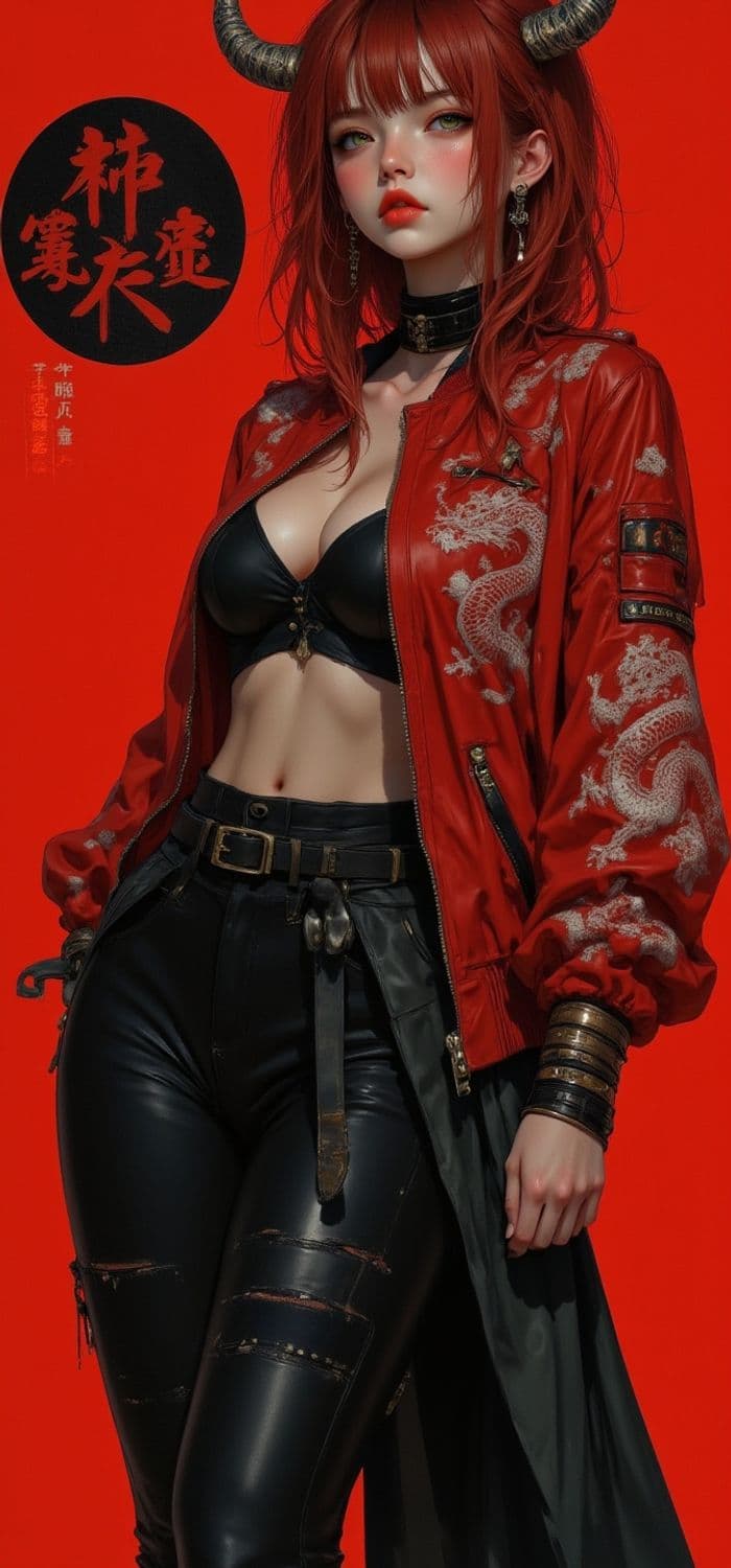 The image portrays a striking figure with long red hair and a pair of distinctive horns. She is dressed in a bold red jacket with intricate dragon designs, paired with a sleek black bra and glossy black pants. Her accessories include a black choker and several bracelets, adding an edgy flair. The overall aesthetic is vivid and confident, with a vibrant red background complementing her attire.