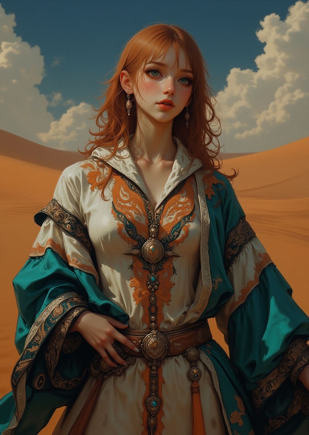 A young woman with flowing auburn hair stands in a desert landscape, adorned in an ornate robe with intricate patterns of orange and teal. Her attire is embellished with jewels and detailed embroidery, exuding an aura of elegance and mystery. The sky is adorned with soft clouds, enhancing the serene yet majestic setting.