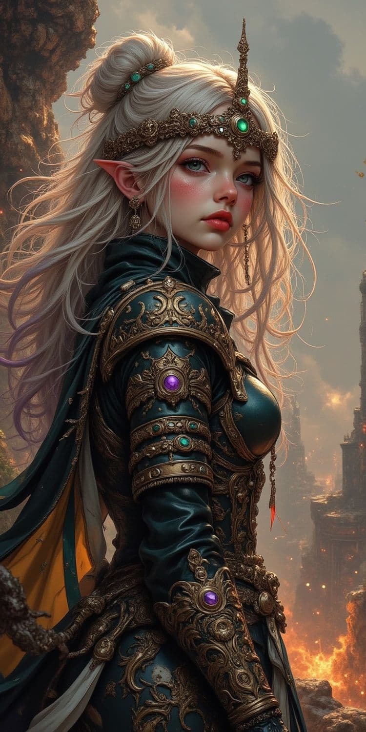 A striking fantasy character with long, flowing white hair and pointed ears is adorned in ornate, golden armor embedded with glowing gemstones. She wears an intricate crown with radiant emeralds, and her expression is serene yet commanding. The background suggests a mystical, fiery landscape with a towering structure enveloped in smoke.