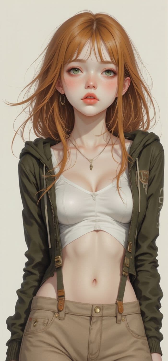 A digital artwork of a young woman with long, flowing red hair and green eyes, wearing a white crop top and an olive green jacket. She has a pendant necklace and is adorned with a calm, slightly ethereal expression. The illustration showcases a blend of realism and stylized anime features, emphasizing her delicate skin and detailed hair strands.