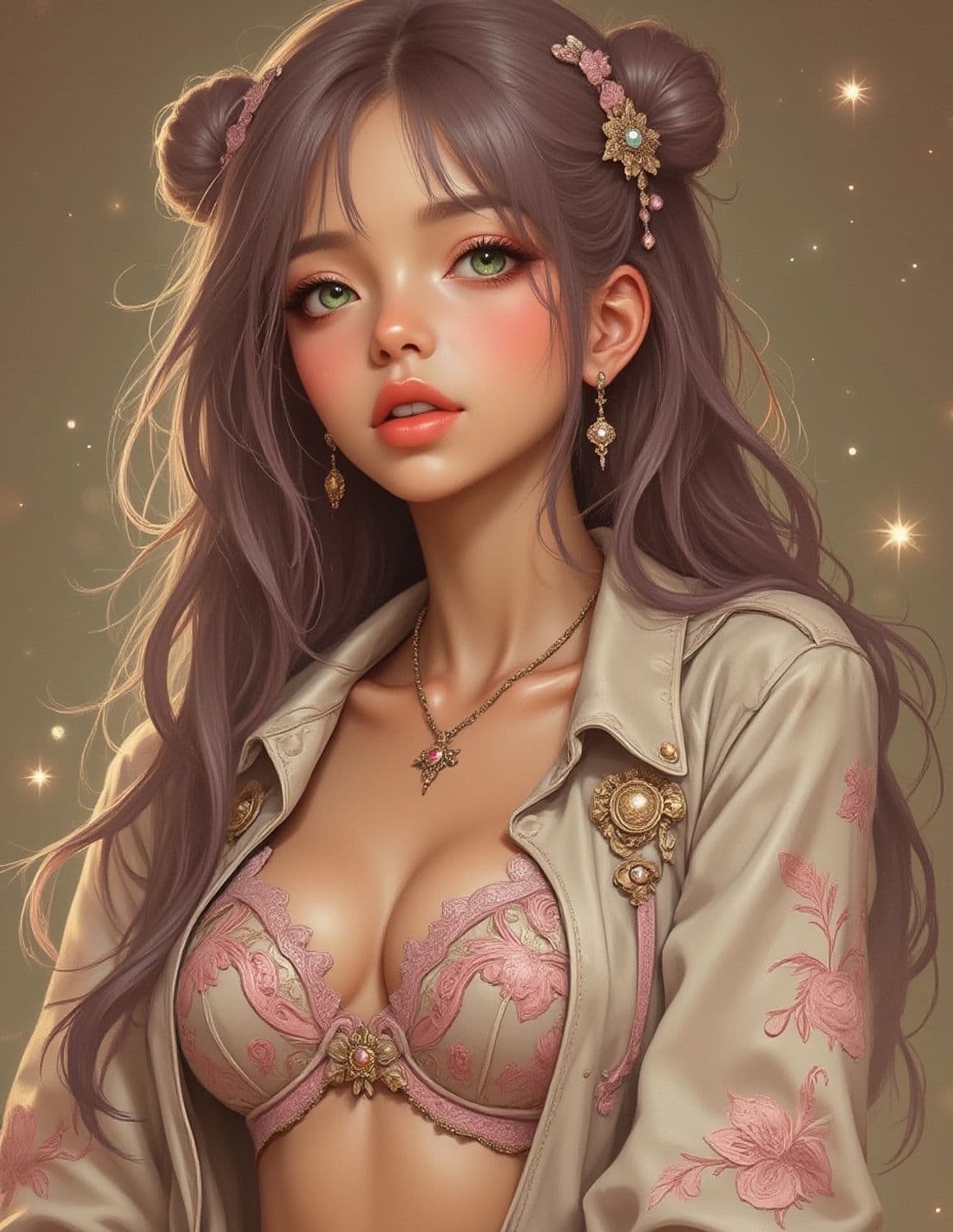 A digital artwork of a young woman with long, flowing hair styled into elegant buns adorned with floral accessories. She wears a floral embroidered jacket, delicately opened to reveal an ornate lace top. Her luminous green eyes and soft pink lips complement the warm, glimmering background filled with small star-like lights.